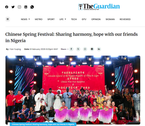 自2026年2月5日起,尼日利亚通讯社、《先锋报》《卫报》《理性之声》、非中媒体中心和非洲绿色电视台等当地主流媒体以及《西非统一商报》《西非华声报》和《西非华文报》等华文媒体陆续刊登驻拉各斯总领事严宇清署名文章《春节——与尼日利亚朋友分享和谐与希望》。全文如下: